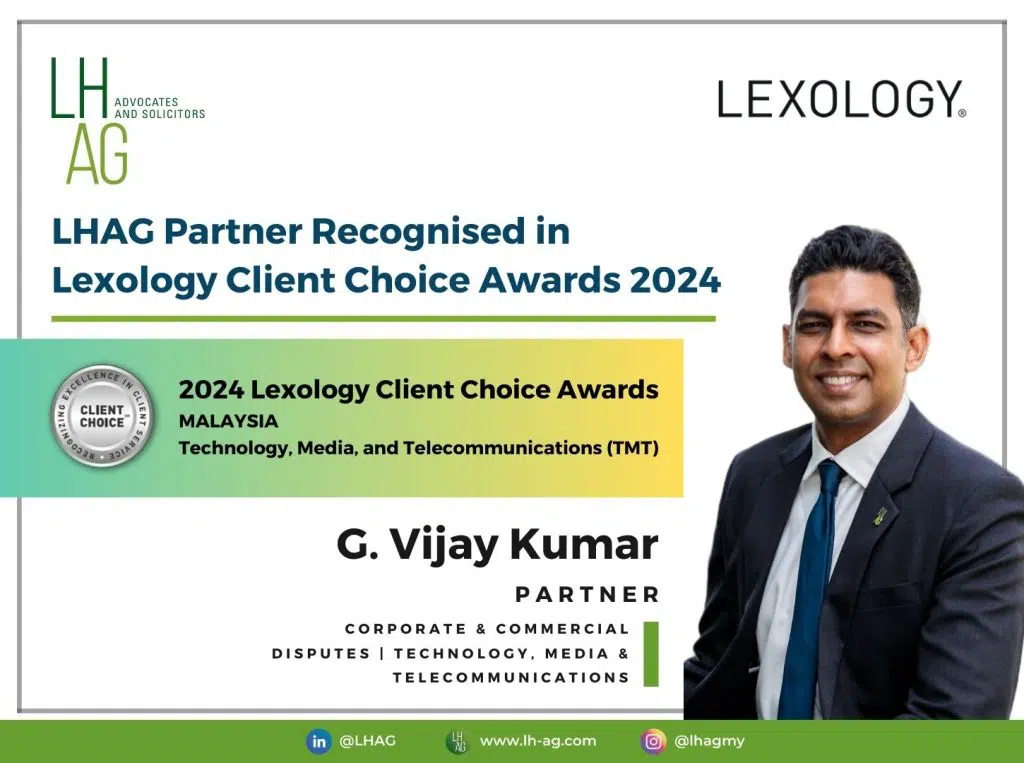 Lee Hishammuddin Allen & Gledhill is delighted to announce that our Partner, G. Vijay Kumar, has been recognised as one of the recipients of the 2024 Lexology Client Choice Awards for Technology, Media, and Telecommunications (TMT). This prestigious award highlights Vijay’s outstanding dedication and exceptional service to our clients.