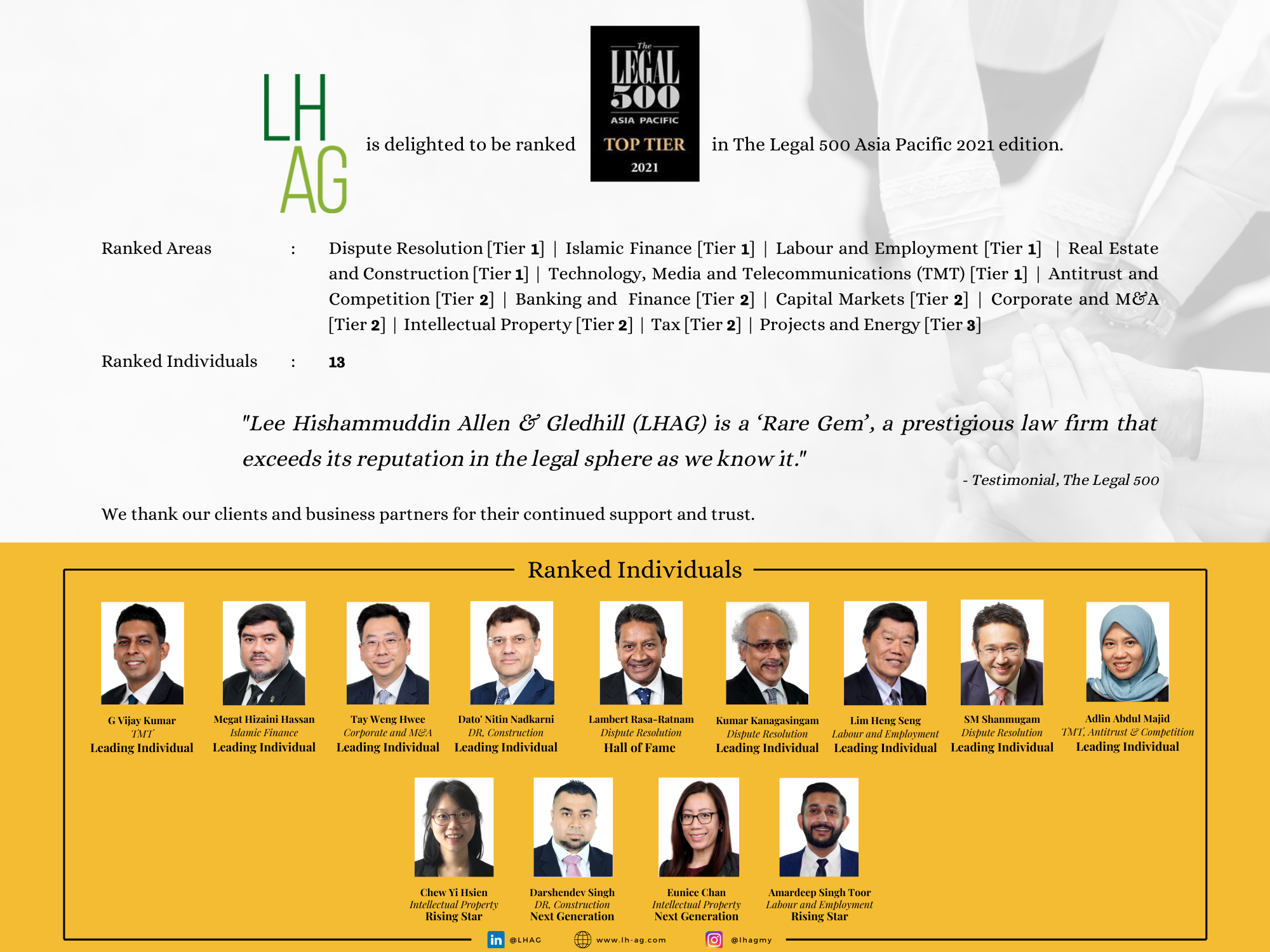 Lee Hishammuddin Allen & Gledhill is honoured to have been ranked in 12 practice areas, and to have 13 of our lawyers individually recognised.